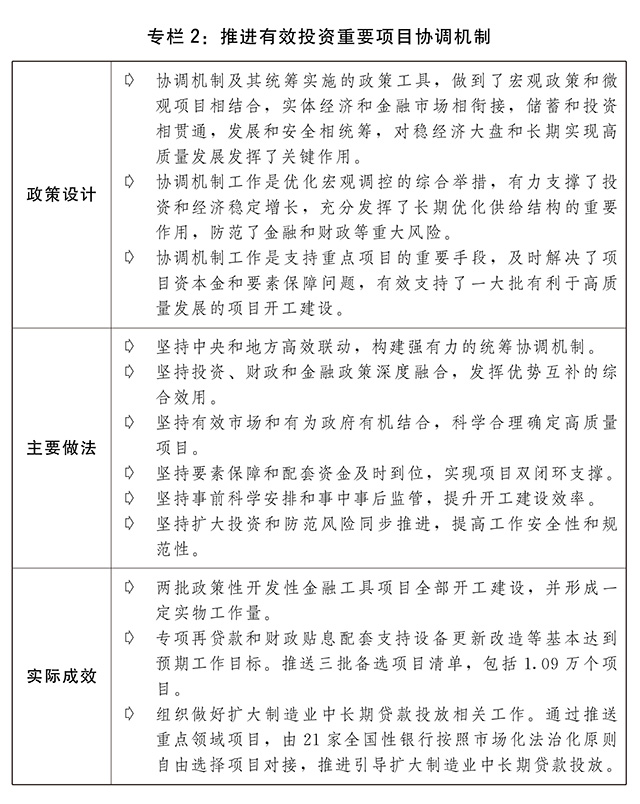 一是投资关键作用充分发挥。建立并高效运转推进有效投资重要项目协调机制,强化用地、环评、用能等要素保障和重大问题协调,做到“资金、要素跟着项目走”,加快推进重点任务落实和重大项目建设,努力形成更多实物工作量。创新设立政策性开发性金融工具,分两批投放基金7400亿元,为重大项目建设补充资本金,支持的2700多个重大项目已全部开工。通过专项再贷款与财政贴息配套支持重点领域设备更新改造,推动扩大制造业中长期贷款投放。适度超前开展基础设施投资,推进“十四五”规划102项重大工程实施,新型基础设施加快布局,川藏铁路全面建设取得良好开局,装机规模全球第二大的白鹤滩水电站全面投产,白鹤滩至江苏、浙江特高压直流输电工程运行,小洋山北侧集装箱码头(陆域部分)、平陆运河工程、南水北调中线引江补汉工程等开工建设。发挥中央预算内投资撬动作用。加快地方政府专项债券发行使用并进一步扩大支持范围。鼓励引导社会资本盘活老项目、投入新项目,促进存量资产和新增投资良性循环,已累计发行上市基础设施领域不动产投资信托基金(REITs)试点项目24个,总发行规模超过780亿元。全面推进城镇老旧小区改造,全国实际新开工老旧小区改造5.25万个。城市基础设施建设短板加快补齐,城市燃气管道等老化更新改造积极推进。全国固定资产投资(不含农户)57.21万亿元,增长5.1%;其中,基础设施、制造业投资分别增长9.4%、9.1%,一定程度弥补了消费收缩缺口。