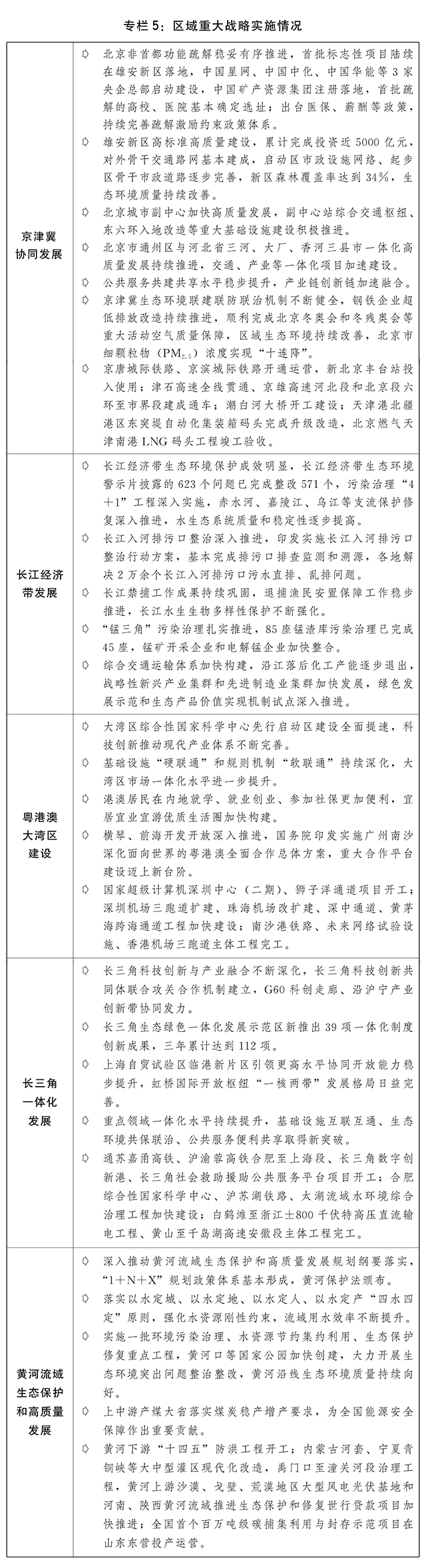 一是区域重大战略扎实推进。京津冀协同发展水平不断提升,一批央企、医院、高校等疏解项目在雄安新区落地,津冀港口群基础设施不断完善,“轨道上的京津冀”更加便捷。长江经济带绿色高质量发展有力推进,长江保护法深入贯彻实施,生态环境突出问题整改、污染治理“4+1”工程成效明显,入河排污口整治等专项行动深入实施,长江流域重点水域十年禁渔进展良好。大湾区综合性国家科学中心先行启动区加快建设,设施联通和规则衔接不断深化,横琴、前海、南沙、河套等重大合作平台建设深入推进。积极推动长三角科创与产业融合发展,G60科创走廊、沿沪宁产业创新带协同发力的创新空间布局不断优化,基础设施、生态环境、公共服务等重点领域一体化水平明显提升。黄河流域生态环境保护、水安全保障、文化保护传承弘扬等专项规划出台实施,黄河流域生态保护和高质量发展先行区加快建设,黄河生态保护治理五大攻坚行动稳步推进。