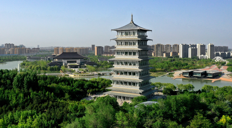 位于西安浐灞生态区的长安塔(2023年4月16日摄,无人机照片)。新华社记者 刘潇 摄