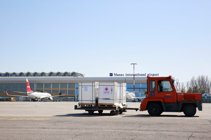 在吉尔吉斯斯坦比什凯克玛纳斯国际机场,工人转运新冠疫苗(2021年3月19日摄)。新华社发(罗曼 摄)