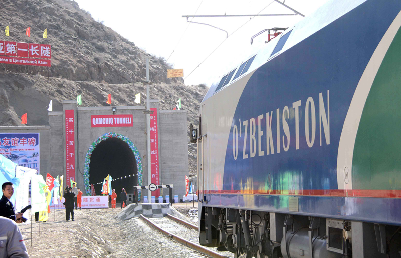 中铁隧道集团承担的乌兹别克斯坦安格连-帕普铁路卡姆奇克隧道全隧贯通(2016年2月27日摄)。新华社记者 沙达提 摄