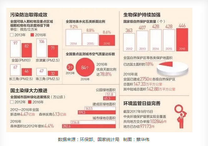 环境大幅改善。2016年,京津冀、长三角、珠三角三个区域PM2.5平均浓度与2013年相比都下降了30%以上。全国酸雨面积占国土面积比例由历史高点的30%左右下降到7.2%。2017年上半年,全国地表水水质优良(Ⅰ—Ⅲ类)水体比例为70.0%。