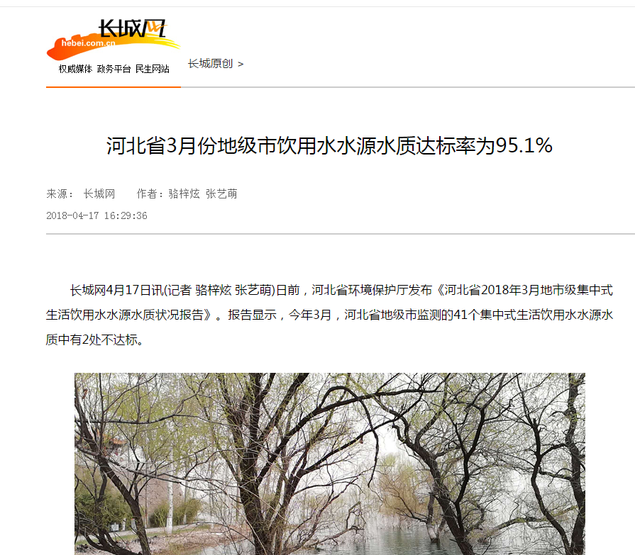 长城网:河北省3月份地级市饮用水水源水质达标率为95.1%
