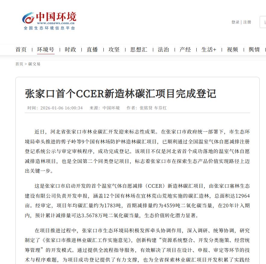 中国环境客户端:张家口首个CCER新造林碳汇项目完成登记
