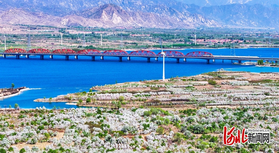 4月29日,怀来官厅水库岸边海棠花绽放,京张高铁列车在花海中穿行。 河北日报记者 耿辉摄