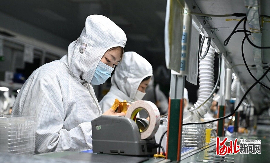 4月7日,在京津冀智能网联新能源汽车科技生态港廊坊园区,入驻企业华田信科(廊坊)电子科技有限公司的工人在生产线工作。该公司生产的车载显示屏供应给北汽福田等车企。 河北日报记者 赵永辉摄