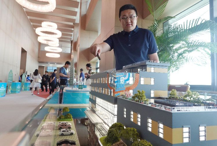 工作人员展示大兴机场综保区及周边非保区能源中心生产调度楼模型,该建筑为近零能耗、零碳绿建三星标准建筑。