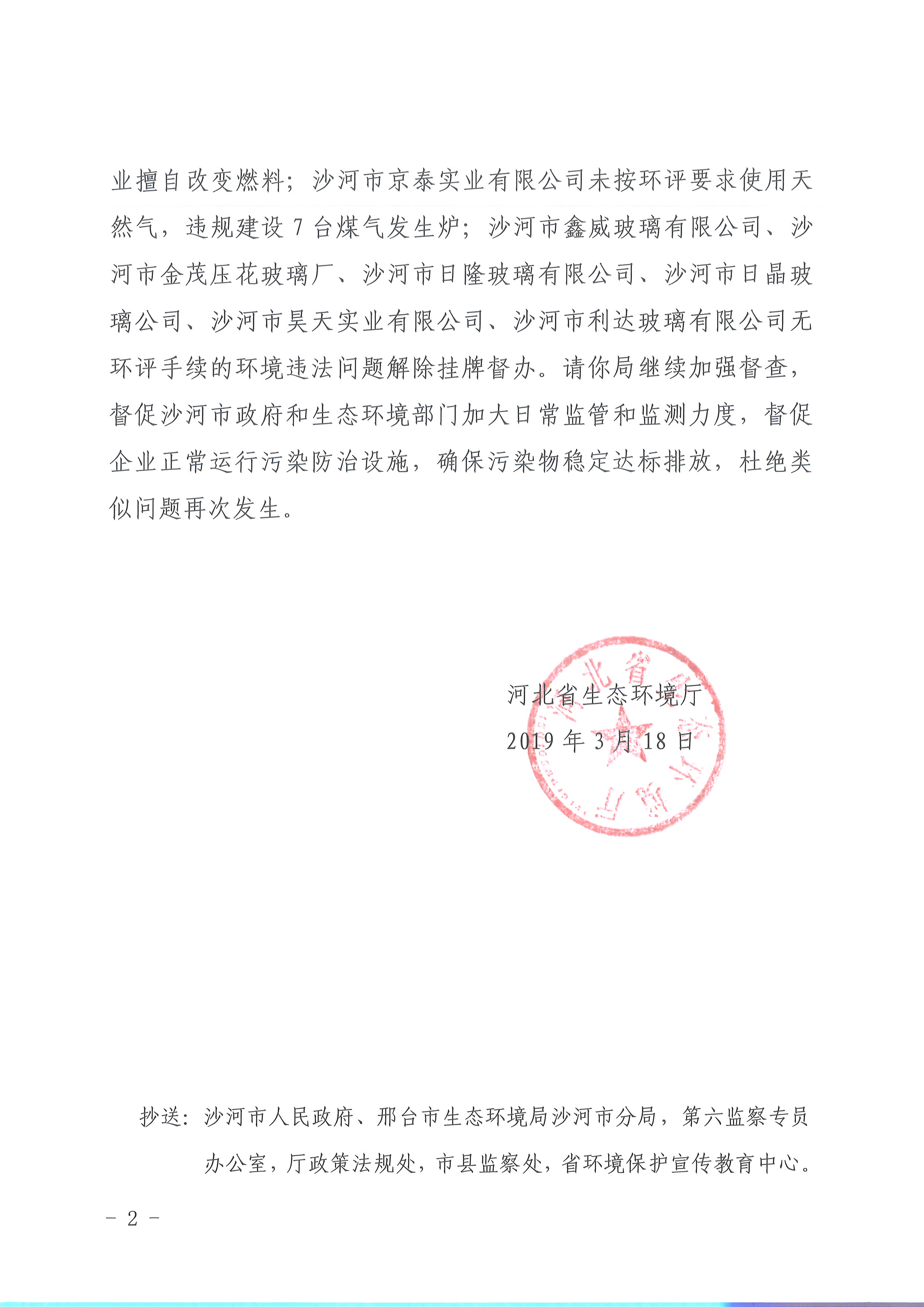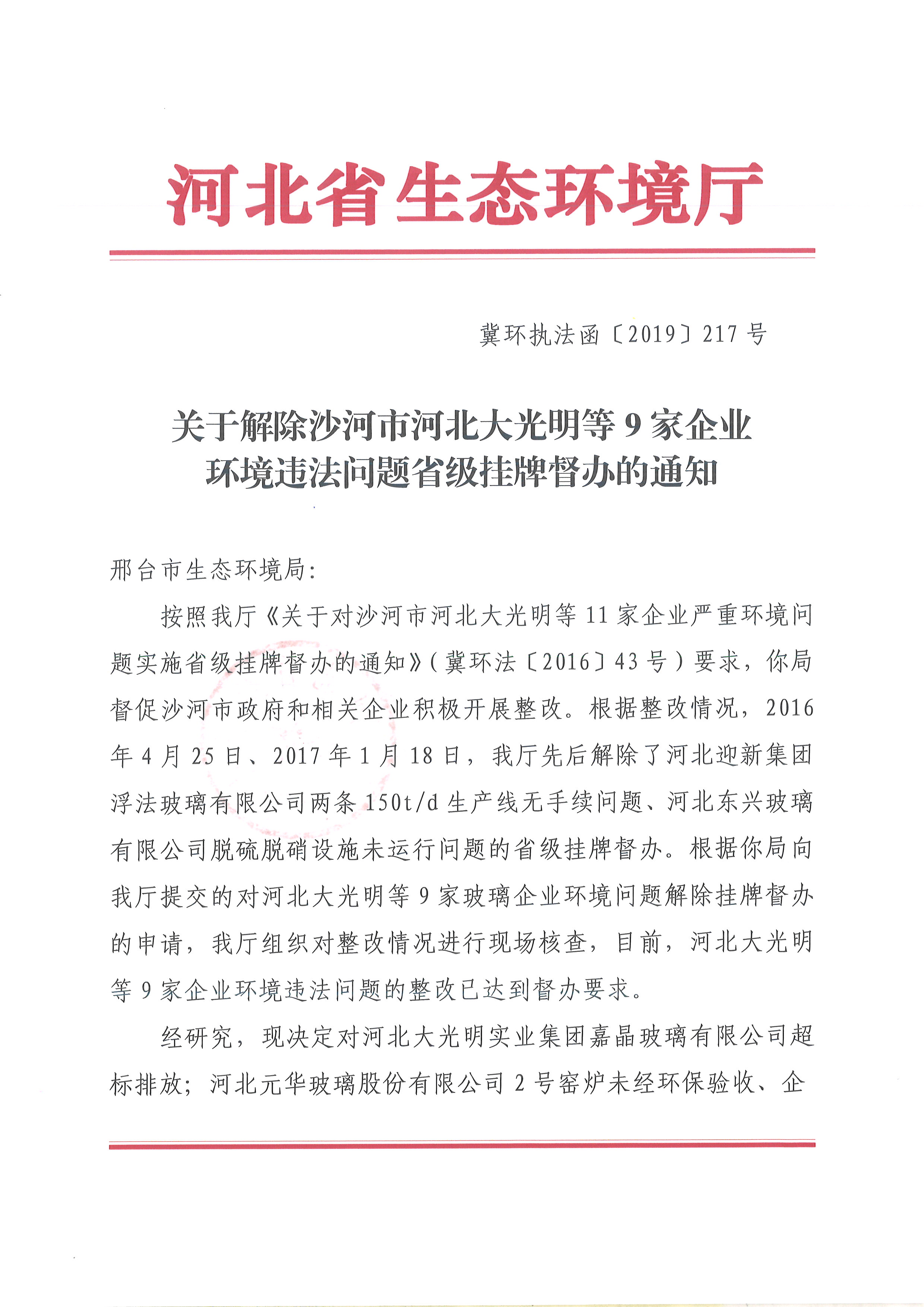关于解除沙河市河北大光明等9家企业环境违法问题省级挂牌督办的通知