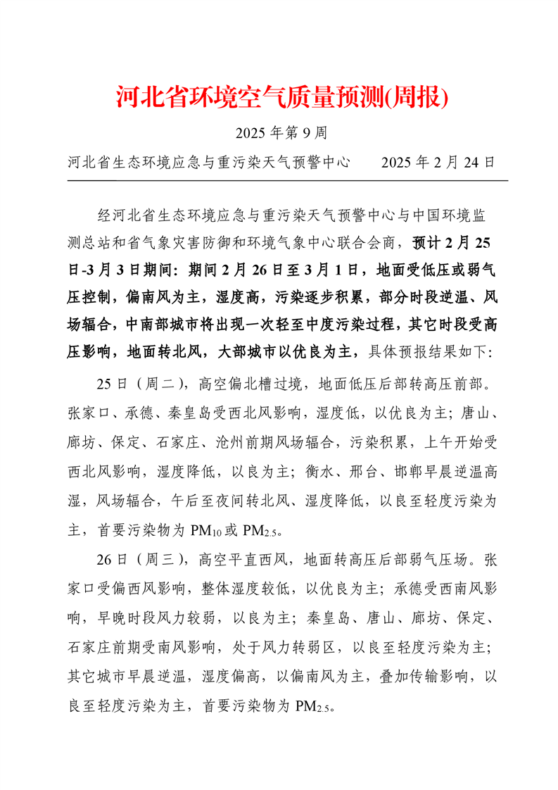 河北省空气质量预测报告(周报)2025年第9周