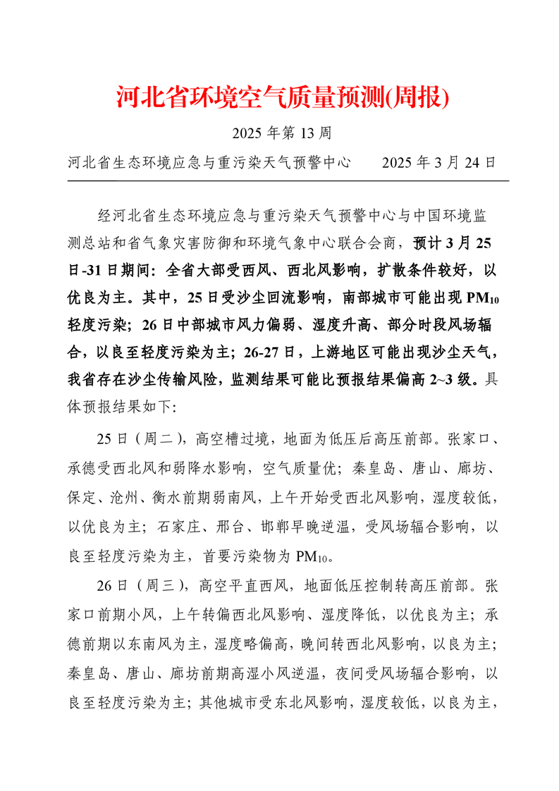 河北省空气质量预测报告(周报)2025年第13周