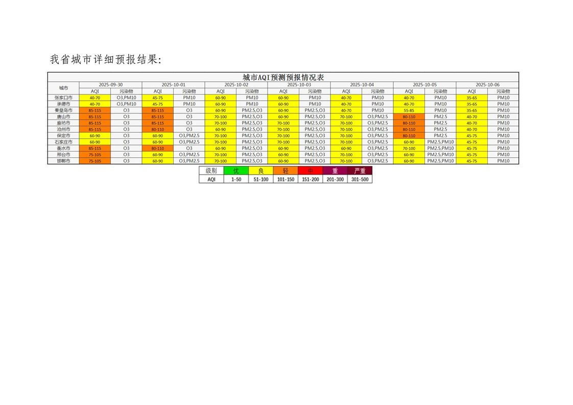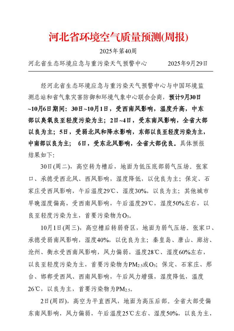 河北省空气质量预测报告周报2025年第40周